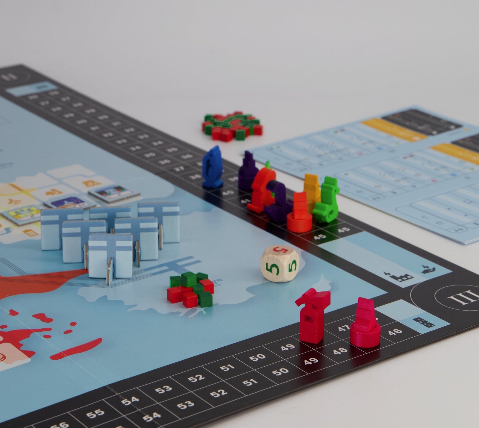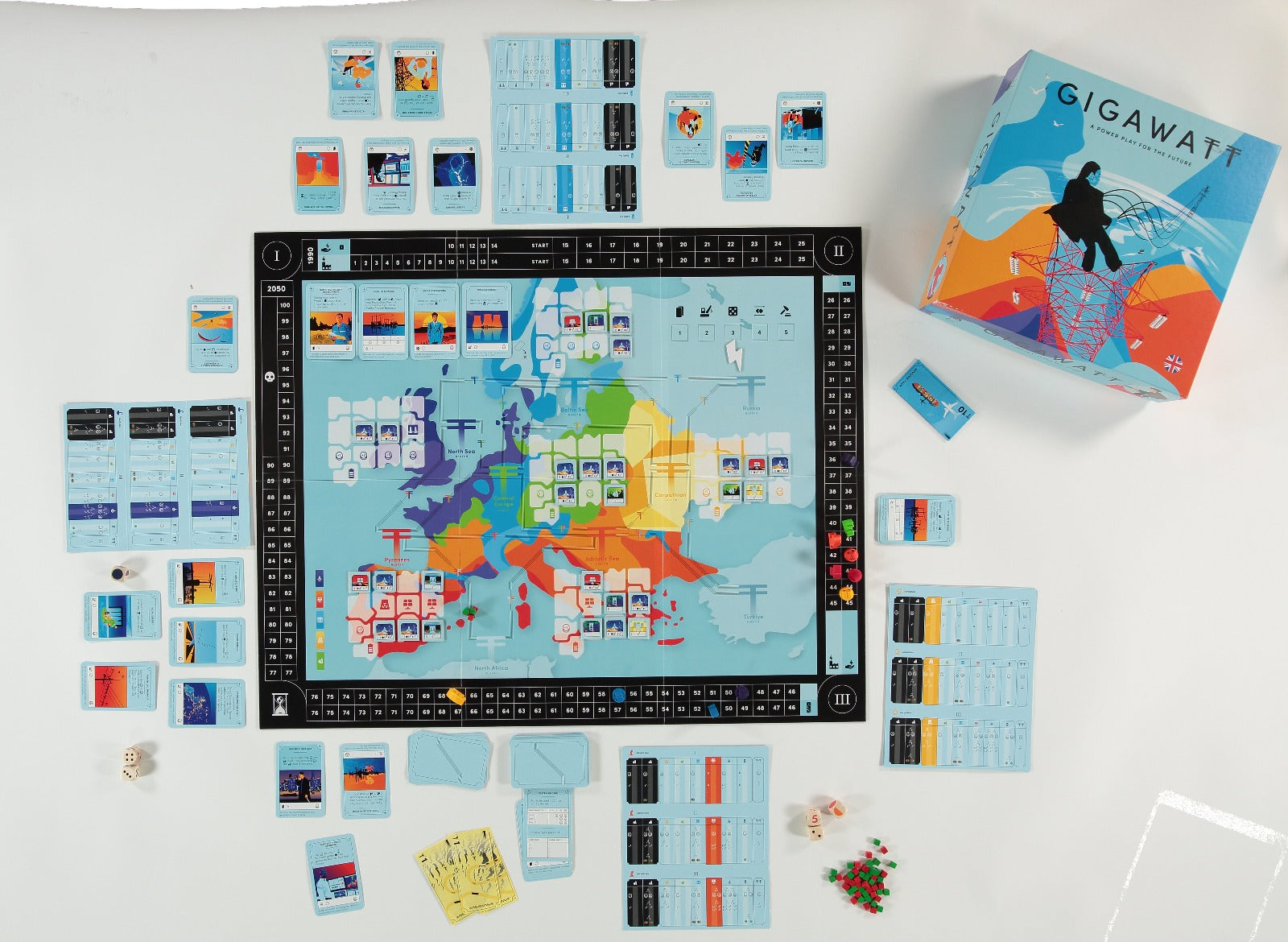 Your region's need for electricity grows with each round, and it is up to you to build power plants to raise your output and meet the need. You will advance technologically through three stages as your region develops, allowing you to build larger and more efficient power plants.